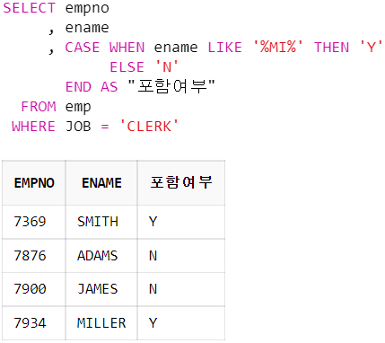 , CASE WHEN ename LIKE '%MI%' THEN 'Y'