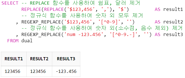 , REGEXP_REPLACE('$123,456', '[^0-9]', '') AS result2