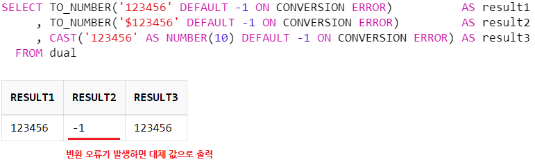 오라클 12c R2부터 ON CONVERSION ERROR 구문을 사용하여 형 변환 시 오류가 발생하면 대체 값을 출력할 수 있다. DEFAULT 뒷부분에 대체 값을 지정하면 된다.