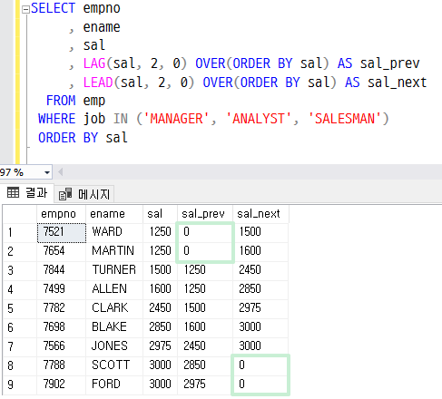 , LAG(sal, 2, 0) OVER(ORDER BY sal) AS sal_prev