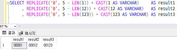 , REPLICATE('0', 5 - LEN(123)) + CAST(123 AS VARCHAR) AS result3