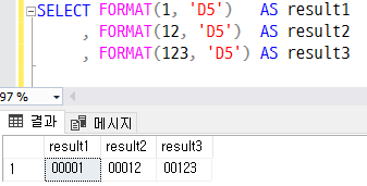 SELECT FORMAT(1, 'D5') AS result1