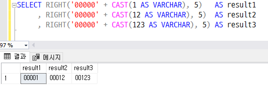 , RIGHT('00000' + CAST(123 AS VARCHAR), 5) AS result3