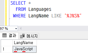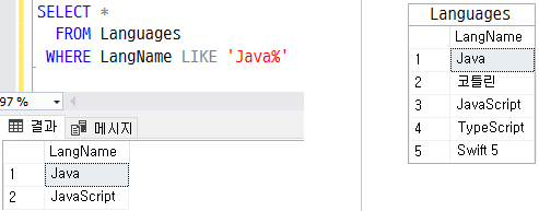 'Java'로 시작하는 문자열을 검색한다. 'Java' 뒤에 %(와일드카드)는 어떠한 문자열이 존재해도 된다는 의미이다.