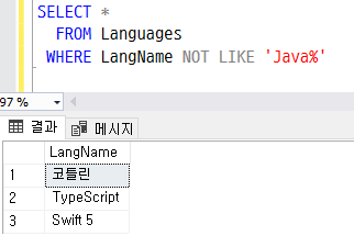 NOT LIKE를 사용하면 'Java'로 시작하는 문자열은 제외하고 검색된다.
