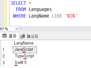 검색어의 앞뒤에 와일드카드(%)가 있기 때문에 'S'의 앞뒤에 어떠한 문자열이 존재해도 상관없다.
