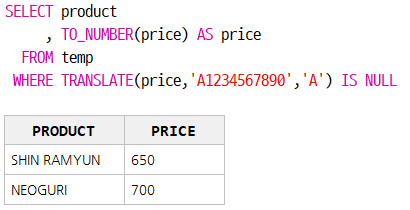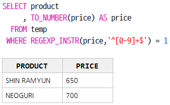 REGEXP_INSTR(price,'[^0-9]') = 0 패턴을 사용해도 동일한 결과를 얻을 수 있다.
