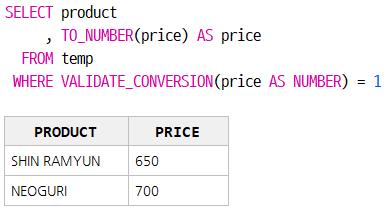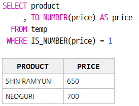 WHERE VALIDATE_CONVERSION(price AS NUMBER) = 1