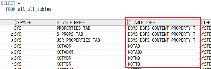 all_tables 대신에 all_all_tables를 사용할 수 있다. all_all_tables 시스템 뷰를 사용하면 객체 테이블도 추가로 조할 수 있다. 일반적인 테이블을 조회한다면 all_tables를 사용하면 된다. all_tables 조회하면 table_type 칼럼 항목은 없으며 all_all_tables를 조회할 때만 table_type 칼럼이 존재하며 값이 NULL이면 일반 테이블, 값이 있으면 객체 테이블이다.