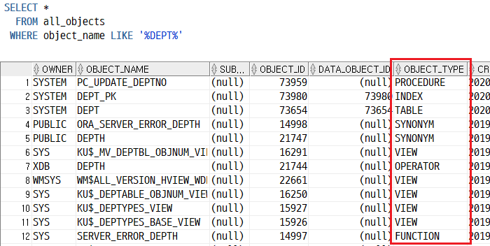 all_objects 뷰는 테이블 조회보다는 전체적인 객체 검색이 필요할 때 많이 사용한다.