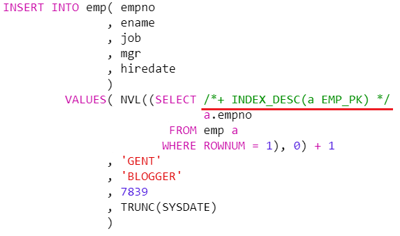 VALUES( NVL((SELECT /*+ INDEX_DESC(a EMP_PK) */