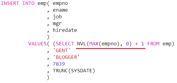 VALUES( (SELECT NVL(MAX(empno), 0) + 1 FROM emp)