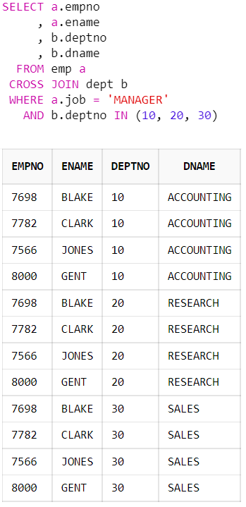CROSS JOIN 절에 테이블 작성하고 메인 테이블과 조인 칼럼을 연결하지 않는다.