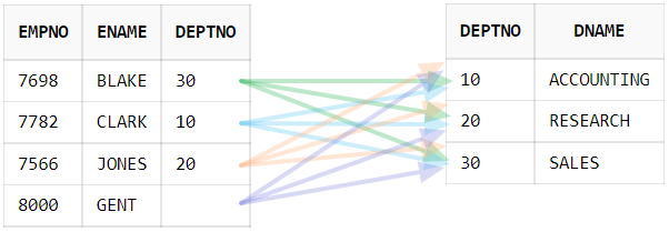 위의 조인 구조를 보면 EMP 테이블의 "GENT"는 DEPT 테이블과 조인이 안되었기 때문에 데이터 조회에서 제외된다.