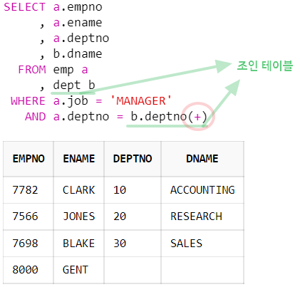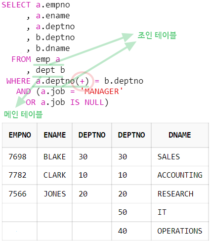 조인 조건을 ON절에서 WHERE 절로 위치가 변경되었고 조인 칼럼에 (+)이 붙어있다.
