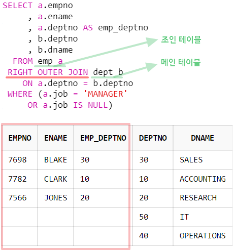 DEPT 테이블이 메인 테이블이기 때문에 DEPT 테이블의 모든 데이터가 조회되고 EMP 테이블은 참조 용도로만 사용된다. 메인 테이블의 위치만 바뀌었을 뿐 LEFT OUTER JOIN과 조인 방법은 동일하다. 특별한 경우가 아니면 RIGHT OUTER JOIN은 사용하지 않는 것이 차후 쿼리문을 분석할 때 가독성을 좋게 할 수 있다.
