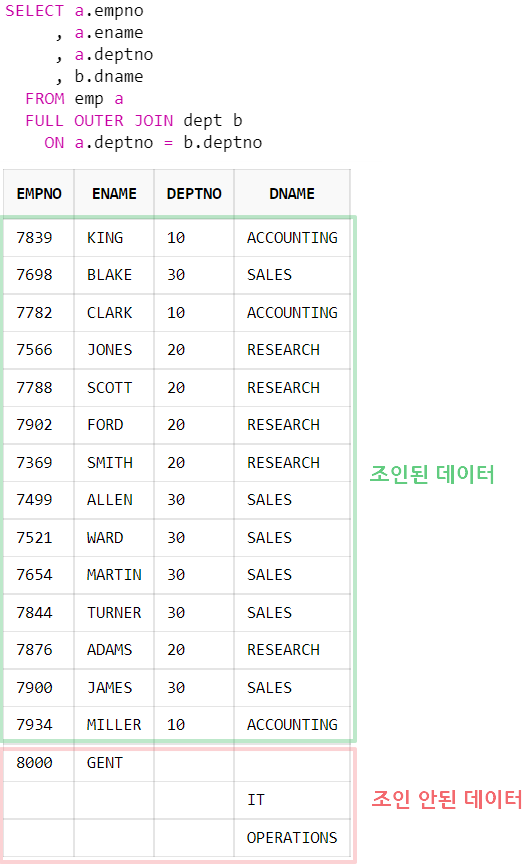 풀 아우터 조인은 ANSI JOIN에서만 사용 가능하고 Oracle Join에서는 사용할 수 없다. 자주 사용하는 조인 방법은 아니기 때문에 개념만 이해하고 있으면 좋을 듯하다.