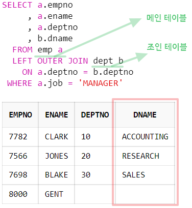 위의 예제는 EMP 테이블과 DEPT 테이블을 아우터 조인(외부 조인)하여 DEPT 테이블의 DNAME(부서명)을 조회한 쿼리이다. 아우터 조인(OUTER JOIN)은 조인 테이블의 값이 존재하지 않아도 메인 테이블의 데이터가 조회된다. 조인 테이블의 값을 가져오지 못하면 NULL로 표시된다.