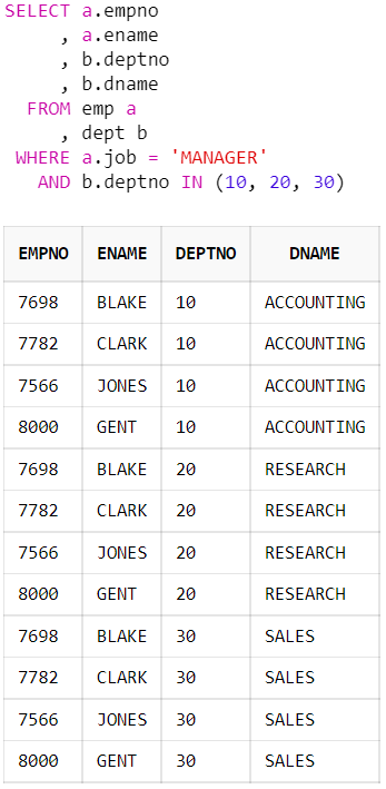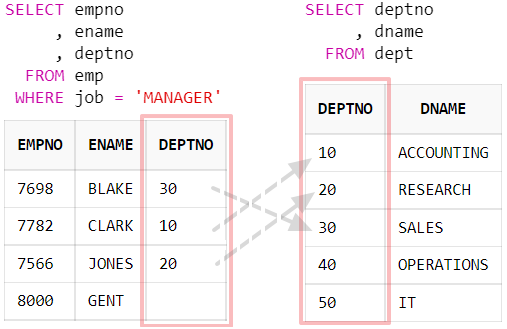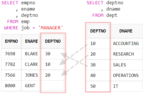 위의 예제는 EMP 테이블과 DEPT 테이블을 조인(내부 조인)하여 DEPT 테이블의 DNAME(부서명)을 조회한 쿼리이다.