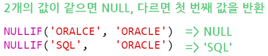 오라클에서 특정 값인 경우 NULL로 치환하기 위해서는 NULLIF 함수를 사용하면 된다. NVL 함수와 조금 반대되는 함수라고 생각하면 된다. NVL 함수는 NULL인 경우 특정 값으로 치환을 하고, NULLIF 함수는 특정 값인 경우 NULL로 치환을 한다. NULLIF 함수는 두 개의 칼럼 값이 동일한지 판단할 때도 사용할 수 있다.