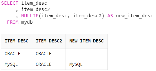 item_desc 칼럼과 item_desc2 칼럼의 값이 같으면 NULL을 반환하고 다르면 item_desc 칼럼의 값을 반환한다.