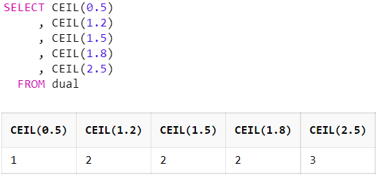 인자 값이 정수인 경우 입력값 그대로 반환한다. (예, CEIL(2) → 2 반환)