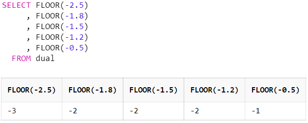 인자 값이 음수인 경우 소수점을 내림할 경우 음수 값이 커지게 되므로 정확히 인지하고 있어야 한다.