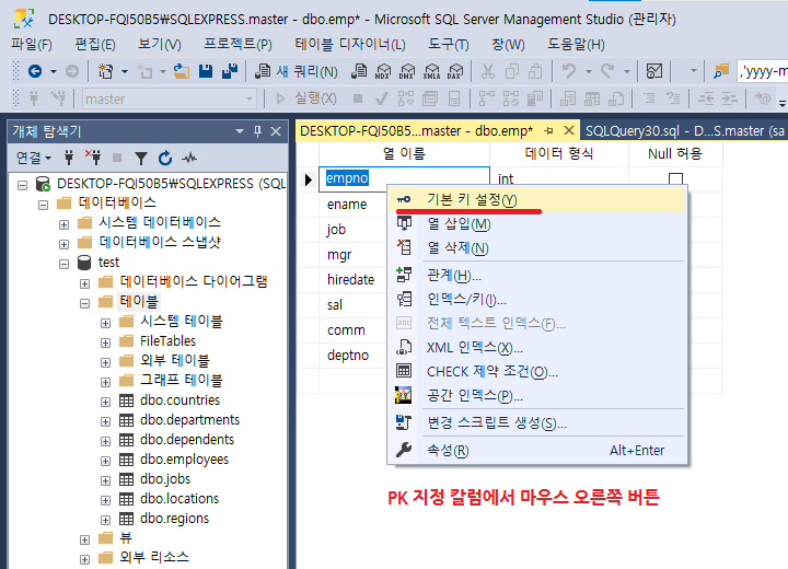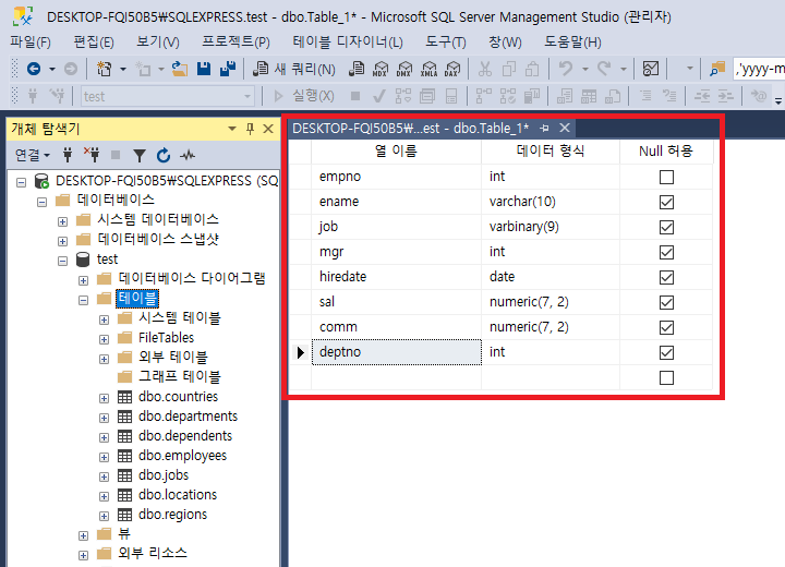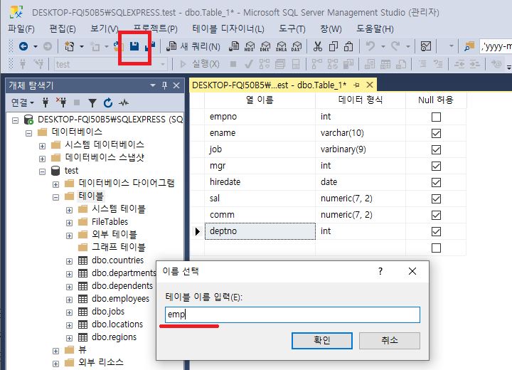 SQL Server에서 테이블을 생성할 때는 대부분 CREATE TABLE 문을 사용해서 테이블을 생성한다. 그러나 SQL 문이 익숙하지 않을 때는 SSMS 툴을 사용하면 조금 더 쉽게 테이블을 생성하거나 테이블 속성을 변경할 수 있다. 아래는 emp 테이블과 dept 테이블을 생성하는 예제이다.