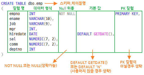 테이블을 생성할 때 테이블 명 앞에 스키마를 지정해야 한다. 스키마를 지정하지 않고 생성을 하면 기본 스키마 dbo에 테이블이 생성된다. (스키마.테이블명, dbo.emp)