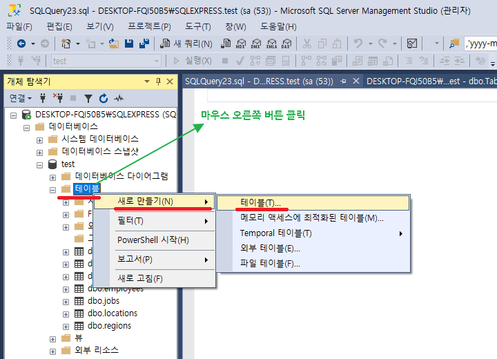 개체 탐색기에서 사용할 데이터베이스 아래의 테이블 폴더에서 테이블 생성 메뉴를 클릭한다.