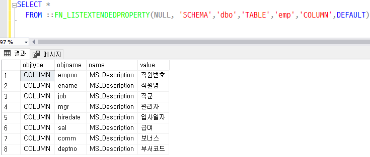 EXEC SP_ADDEXTENDEDPROPERTY 'MS_Description', '부서코드 ', 'USER', dbo, 'TABLE', emp, 'COLUMN', deptno