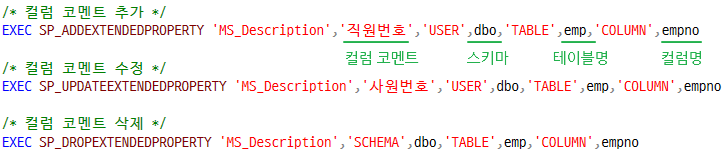EXEC SP_ADDEXTENDEDPROPERTY 'MS_Description', '직원번호', 'USER', dbo, 'TABLE', emp, 'COLUMN', empno