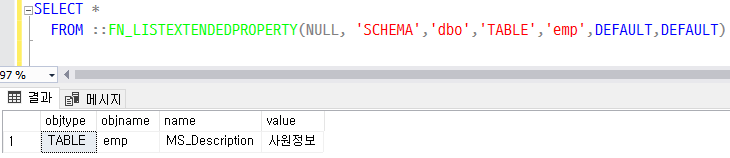 EXEC SP_ADDEXTENDEDPROPERTY 'MS_Description', '직원정보', 'USER', dbo, 'TABLE', emp