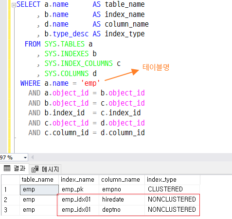 emp 테이블을 조회하면 emp_idx01 인덱스가 비클러스터형으로 생성된 것을 확인할 수 있다.