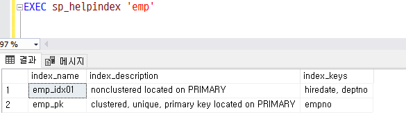 시스템 저장 프로시저로 인덱스 조회 (sp_helpindex)