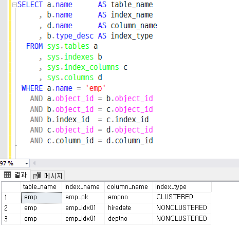시스템 테이블로 인덱스 조회 (sys.indexes)