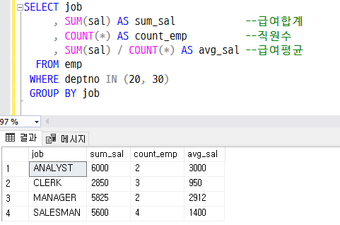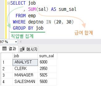 직업(job) 별로 급여(sal) 총합계를 구하는 예제이다.