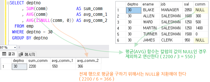 | AVG | 평균 | 칼럼의 값이 NULL 인 경우 제외 |