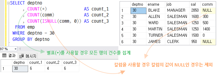 | COUNT | 건수 (행의 개수) | 칼럼의 값이 NULL 인 경우 제외 |