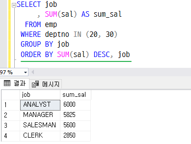 GROUP BY 절 하단에 ORDER BY 절을 사용할 수 있으며, GROUP BY 절과 함께 ORDER BY 절을 사용할 경우 ORDER BY 절에서 집계 함수를 사용할 수 있다.