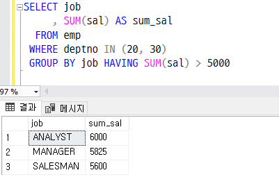 급여(sal)의 합계가 5000 보다 큰 직업(job)만 조회하는 예제이다.