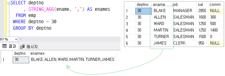 STRING_AGG 함수는 문자열 칼럼의 값을 하나의 칼럼으로 합치는 경우 사용한다.