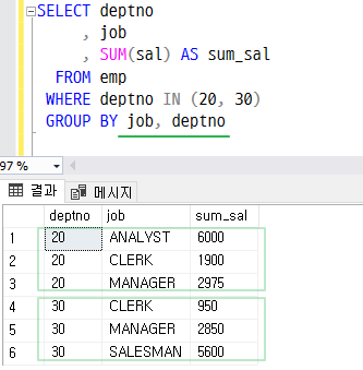 그룹 칼럼이 여러 개인 경우 첫 번째 칼럼(deptno)으로 먼저 그룹이 묶이고, 두 번째 칼럼(job)으로 집계가 된다.