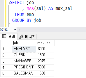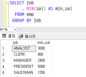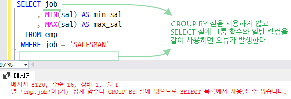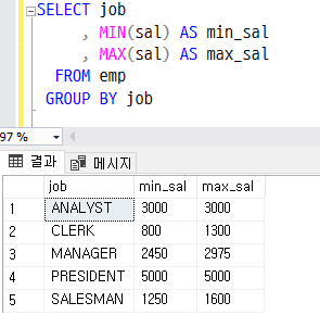 GROUP BY 절을 사용하지 않으면 집계 함수(MIN, MAX)만 SELECT 절에 사용할 수 있으며, 일반 칼럼(job)을 같이 사용하기 위해서는 GROUP BY 절을 사용해서 그룹으로 집계를 해야 한다.