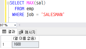 직업(job)이 "SALESMAN"인 직원의 최고 급여(sal)를 조회한다.