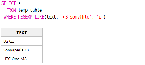 WHERE REGEXP_LIKE(text, 'g3|sony|htc', 'i')