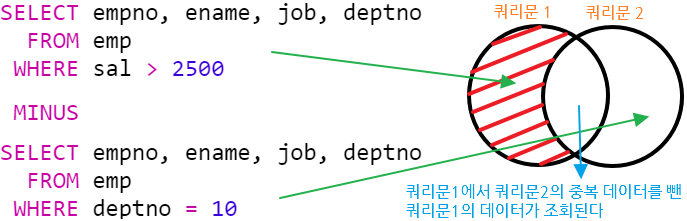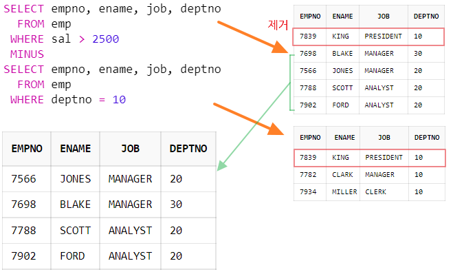 MINUS 연산자를 사용할 때는 MINUS 연산자를 사용하여 쿼리문을 위아래로 연결하면 된다.