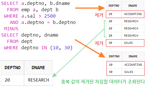MINUS 연산자는 차집합의 결과에서 중복이 제거된 데이터를 반환한다.