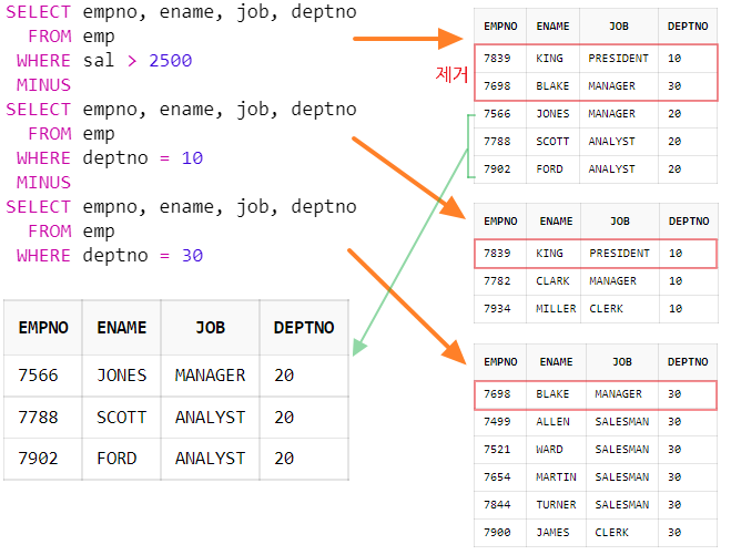 MINUS 연산자를 여러 번 사용할 경우 첫 번째 쿼리 문의 결과에서 두 번째, 세 번째 쿼리 문의 중복 데이터를 모두 제외하고 조회한다고 생각하면 된다.