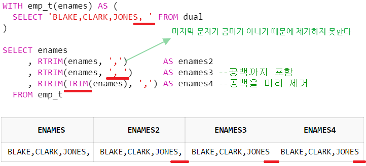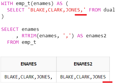 RTRIM 함수는 오른쪽 콤마가 존재할 경우 제거를 하고 없을 경우 아무런 작업을 하지 않는다.